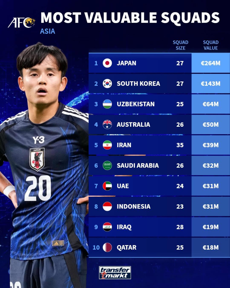 시장가치로는 일본이 으뜸이었다. 매체 기준, 27명의 스쿼드를 보유한 일본 대표팀의 시장가치는 무려 2억 6400만 유로(약 4600억원)에 달했다. 바로 뒤의 한국은 1억 4300만 유로(약 2500억원)로 역시 높았으나, 일본에 비하면 격차가 컸다. 전체 대륙으로 범위를 넓히면 일본은 이 부문 26위, 한국은 45위로 격차가 더 벌어진다.