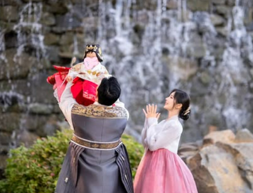 특히 폭포를 배경으로 한복을 차려입고 아이를 번쩍 들어 올린 남편 옆에서 행복하게 박수를 치는 모습과, 아이와 눈을 맞추며 미소 짓는 평온한 일상이 눈길을 끈다.