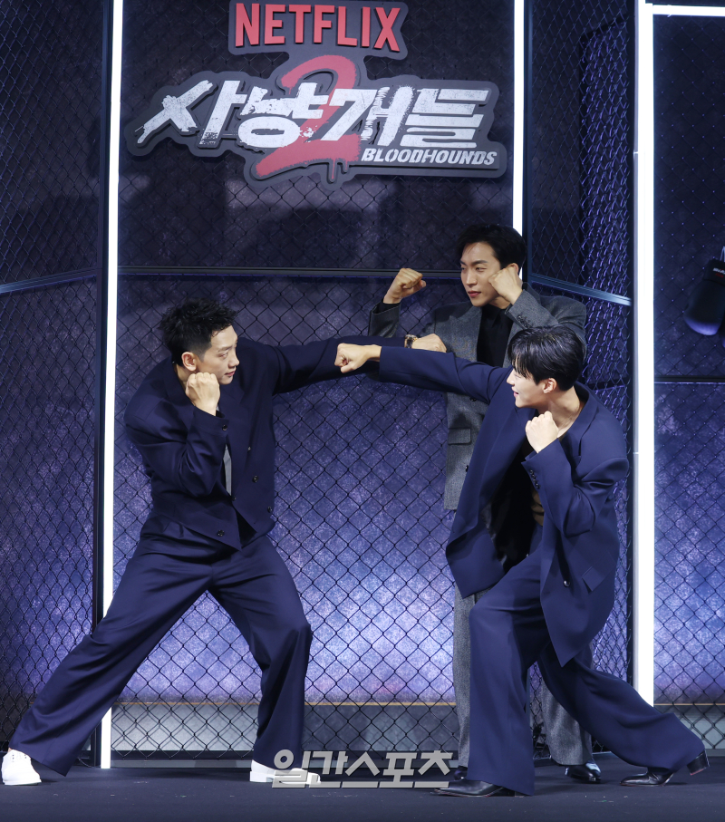[포토] '사냥개들' 시즌2, 화이팅 이날 배우들은 시즌2의 관전 포인트로 한층 강력해진 액션과 인물 간 케미스트리를 꼽았다. 우도환은 “역시 액션”이라며 “시즌1을 마칠 때 더 이상 두 주먹으로 보여줄 수 있는 액션이 있을까 생각했는데, 시즌2 대본을 받고 감독님과 이야기하면서 ‘아직 보여줄 게 많구나’ 느꼈다. 여전히 두 주먹으로 보여줄 수 있는 것들이 많다”고 자신감을 드러냈다. 이상이는 “요즘 인공지능(AI) 이야기가 많지만, ‘사냥개들’은 아날로그적으로 땀을 흘려가며 치열하게 만들었다”며 “그 노력이 작품에 잘 담겼다고 생각한다”고 강조했다. 정지훈은 “우도환, 이상이의 브로맨스뿐 아니라 저희 조직의 브로맨스도 굉장히 뜨겁다. 거의 H.O.T.”라며 “다섯 명의 호흡이 정말 좋다. 악당들끼리 서로 이간질하고 협박하는 모습도 흥미롭게 봐주셨으면 한다”고 관전 포인트를 짚었다.