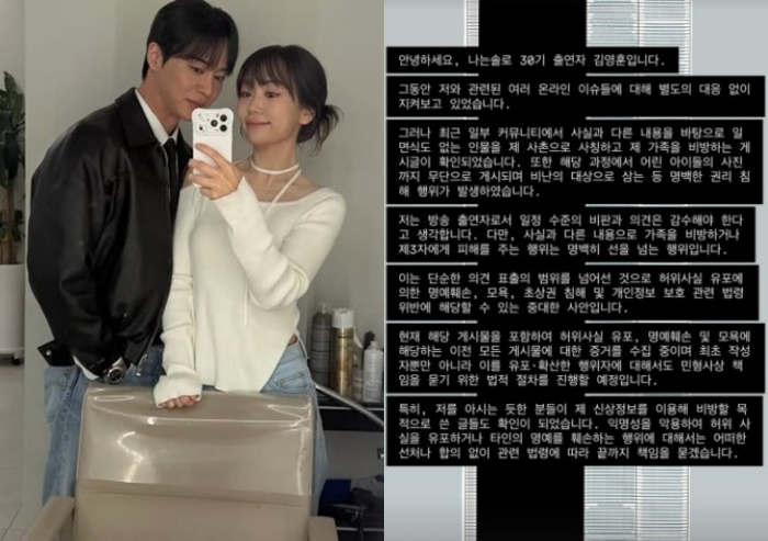 이어 “저는 방송 출연자로서 일정 수준의 비판과 의견은 감수해야 한다고 생각합니다. 다만, 사실과 다른 내용으로 가족을 비방하거나 제3자에게 피해를 주는 행위는 명백히 선을 넘는 행위”라며 “이는 단순한 의견 표출의 범위를 넘어선 것으로 허위사실 유포에 의한 명예훼손, 모욕, 초상권 침해 및 개인정보 보호 관련 법령 위반에 해당할 수 있는 중대한 사안”이라고 했다.
