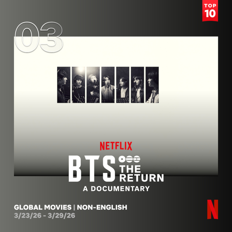 11일 넷플릭스 투둠 웹사이트에 따르면 오리지널 다큐멘터리 ‘BTS: 더 리턴’(BTS: THE RETURN)은 공개 사흘 만에 330만 시청수(시청시간을 작품의 총 러닝타임으로 나눈 값)를 기록하며 지난주(3월 23일~29일) 글로벌 톱10 영화(비영어) 부문 3위에 랭크됐다.