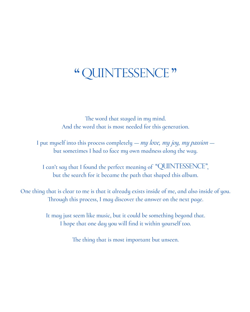 공개된 이미지에는 ‘퀸테센스’라는 단어와 함께, 의미심장한 메시지가 담겨 있어 눈길을 사로잡는다. '내 마음 속에 머무른 단어, 이 시대가 가장 필요로 하는 단어'라는 언급으로 시작해 '가장 중요한 것은 보이지 않는다'는 문장으로 마무리한 메시지는 궁금증을 자아내며 컴백 기대감을 높이고 있다.