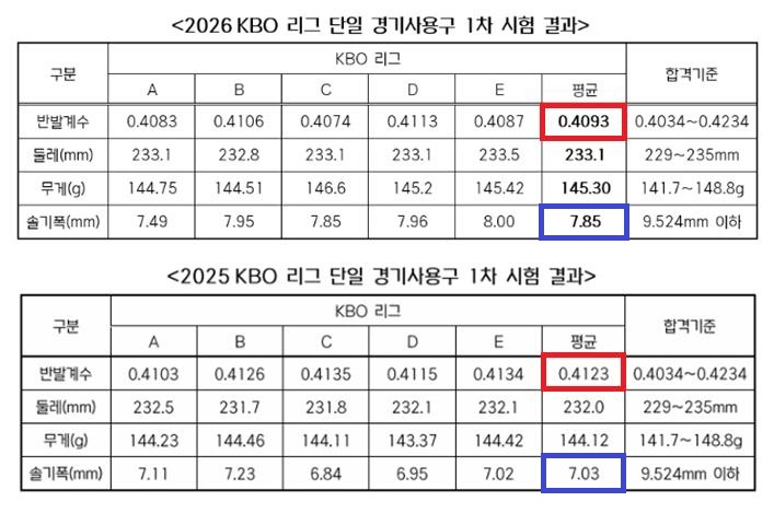 반발계수는 수치상 낮아졌지만, 솔기폭 변화라는 또 다른 변수는 시즌 초반 투수들의 감각과 구종 선택에 적잖은 영향을 줄 수 있다. 숫자만으로는 설명되지 않는 공인구의 미묘한 차이가 올 시즌 KBO리그 마운드 판도에 어떤 변화를 불러올지 주목된다.