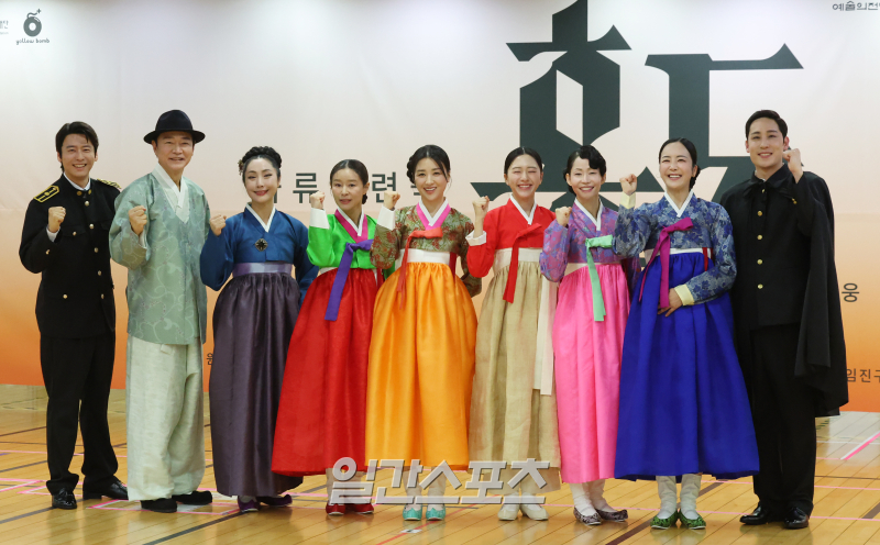 배우 홍의준, 정보석, 이도유재, 예지원, 박하선, 최하윤, 김윤아, 박주연, 임진구가 1일 오후 서울 성신여대 미아운정그린캠퍼스 마루연습실에서 열린 연극 '홍도' 제작발표회에 참석해 포토타임을 갖고 있다.