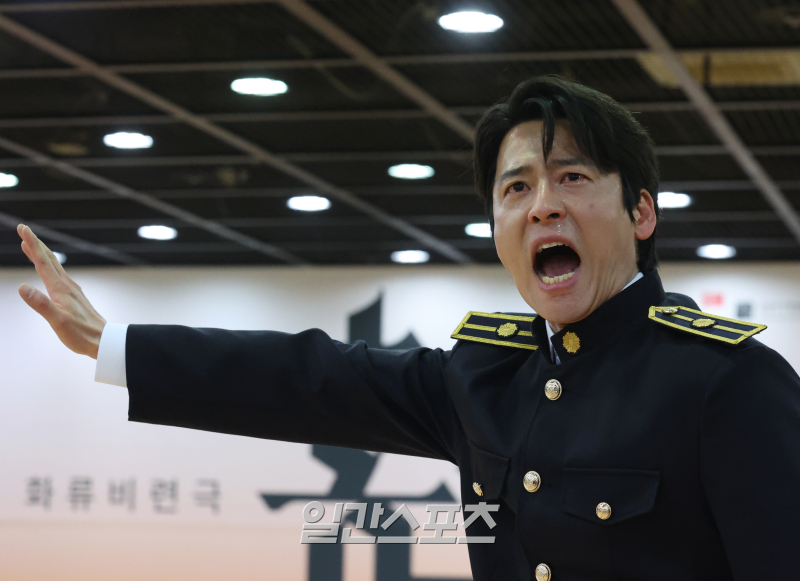 배우 홍의준이 1일 오후 서울 성신여대 미아운정그린캠퍼스 마루연습실에서 열린 연극 '홍도' 제작발표회에 참석해 하이라이트 시연을 하고 있다.