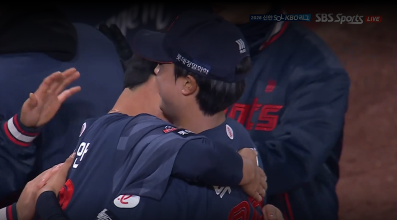 박정민은 세리머니를 내다가 삼켰다. 반면 나균안은 팀이 승리한 것처럼 더그아웃으로 들어오는 박정민을 반기기 위해 뛰어나갔다. 이내 그는 박정민에게 '백허그'를 하며 후배를 격려했다.