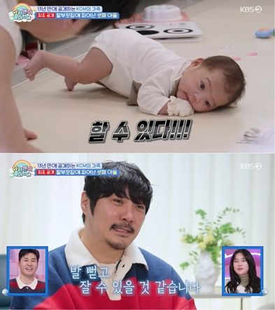 사진=KBS2 딸바보였던 KCM은 아들 육아에서 180도 다른 모습을 보였다. 그는 “딸은 솜사탕 같은 느낌인데 아들은 돌덩이 같다”며 뼈 무게부터 다른 아들 맞춤형 육아를 시작했다. 특히 “하온아 터미타임 할 수 있지? 할 수 있다!”를 외치며 스파르타 아빠로 변신해 웃음을 자아냈다. 하온이는 아빠의 응원에 응답하듯 시원하게 방귀를 뀌며 ‘방귀대장’에 등극했고, KCM은 “아들이라 그런지 방귀 냄새도 다르다”는 엉뚱한 소감으로 폭소케 했다.