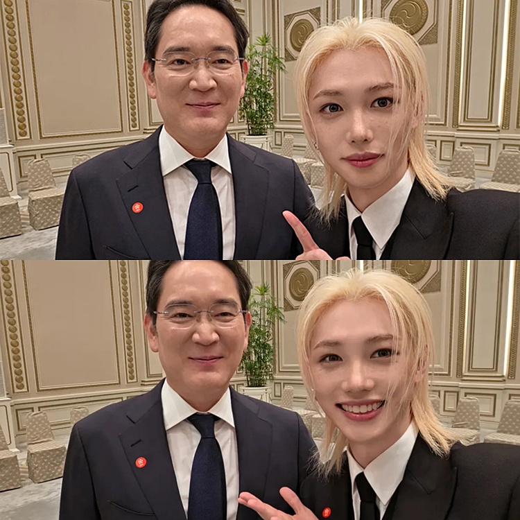사진 속 필릭스는 금발 헤어에 블랙 슈트와 타이를 매치한 차림으로 카메라를 응시하며 손가락 하트 포즈를 취하고 있다. 이재용 회장은 네이비 톤 슈트를 입은 채 옅은 미소를 짓고 있어 눈길을 끈다. 필릭스는 하트 이모지와 함께 “ㅎㅎ”이라는 짧은 글을 덧붙였다.