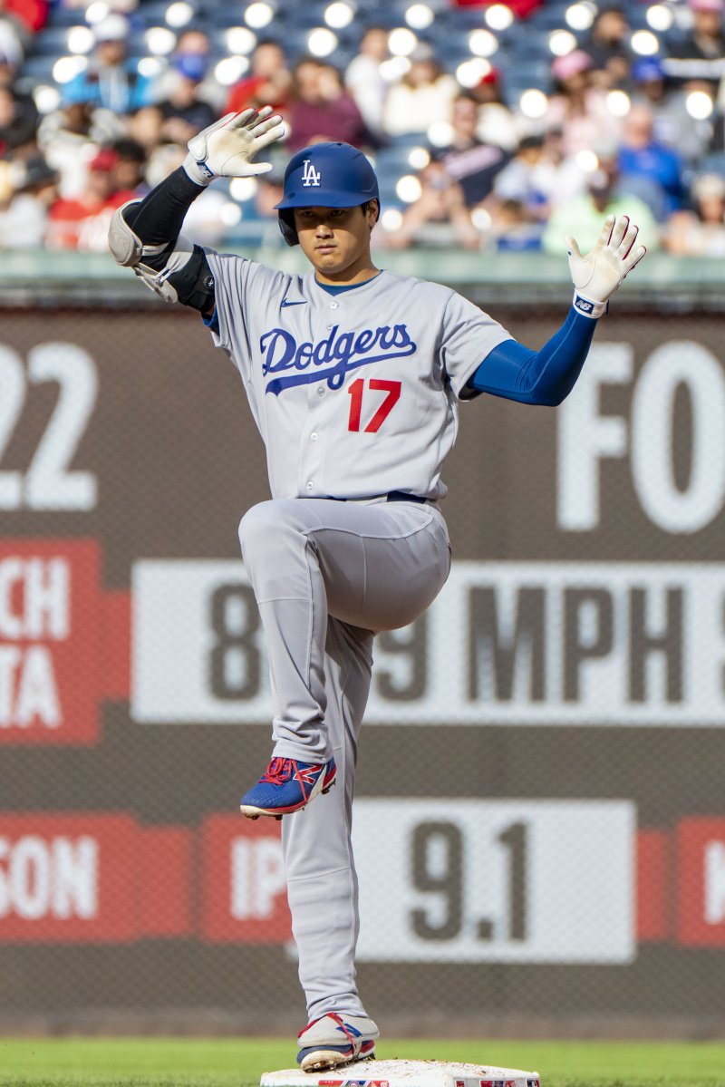 6일(한국시간) 열린 워싱턴 내셔널리스전에서 2루를 밟은 뒤 세리머니하는 오타니 쇼헤이. [UPI=연합뉴스]