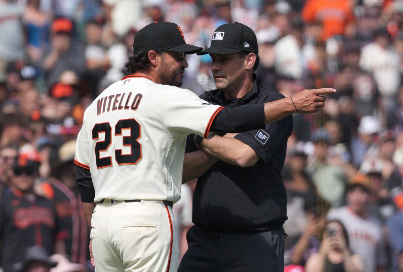 SAN FRANCISCO, CALIFORNIA - APRIL 05: Manager Tony Vitello #23 of the San Francisco Giants argues with third base umpire Dave Rackley #86 after he threw Vitello out of the game against the New York Mets in the bottom of the seventh inning at Oracle Park on April 05, 2026 in San Francisco, California. Thearon W. Henderson/Getty Images/AFP (Photo by Thearon W. Henderson / GETTY IMAGES NORTH AMERICA / Getty Images via AFP)/2026-04-06 07:33:16/ <저작권자 ⓒ 1980~2026 ㈜연합뉴스. 무단 전재 재배포 금지, AI 학습 및 활용 금지>