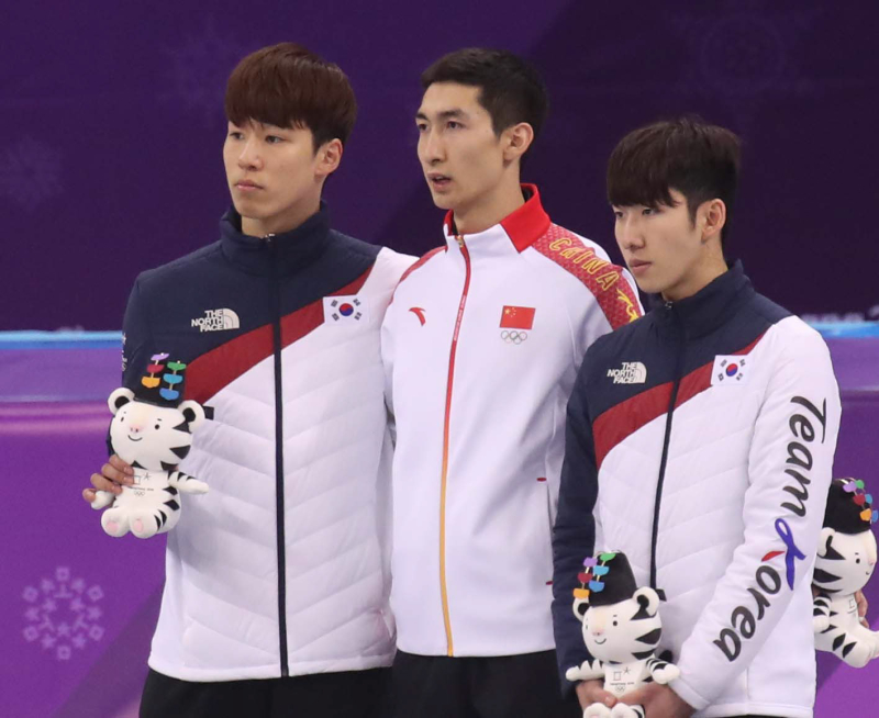 22일 강릉 아이스아레나에서 열린 2018 평창동계올림픽 쇼트트랙 남자 500m에서 은메달을 따낸 대한민국 황대헌과 임효준이 세리머니에서 관중에게 인사하고 있다. IS 포토