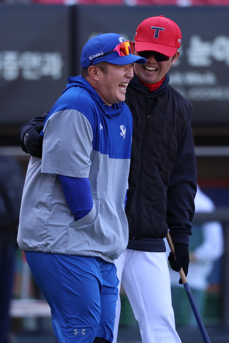 7일 광주 KIA전에 앞서 훈련 중 손승락 KIA 코치와 대화하는 최형우(왼쪽)의 모습. 삼성 제공