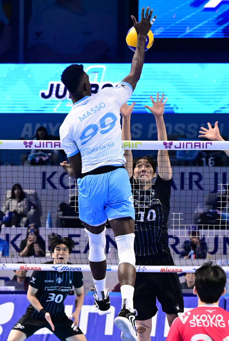 마쏘는 2024~25시즌 독일 리그의 VfB 프리드리히스하펜에서 뛰며 최우수 미들 블로커상을 받았다. 이번 시즌엔 이란 리그의 파이칸에서 아포짓 스파이커로 활약했다. 큰 키(2m4㎝)를 활용한 스파이크 타점과 철벽 블로킹이 강점이다. 대한항공은 토종 공격수 임동혁이 전역 후 마지막 6라운드에서 좋은 모습을 보인 만큼, 마쏘를 미들 블로커로 기용하며 높이와 중앙 공격을 강화한다는 계산이었다. 마쏘는 챔프 1차전에서 18득점에 공격성공률 71.43%를 기록했다. 4일 2차전에서는 15점에 성공률 59.09%였다. 3차전에선 득점력이 떨어졌다. 챔프전 3경기 동안 범실이 23개로 너무 많다.