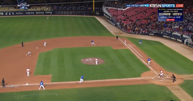 7일 광주-기아챔피언스필드에서 열린 KIA-삼성전 8회 초 나온 구자욱의 땅볼 상황. 유격수 데일의 포구 직후 구자욱은 1루에서 꽤 멀어져 있다. 타이밍상 아웃에 병살타가 가능했으나 데일은 홈으로 송구, 아웃카운트를 1개만 챙겼다. 이닝이 종료되지 않은 삼성은 후속 타선이 폭발하며 승부를 뒤집었다. KBSN스포츠, 티빙 캡처
