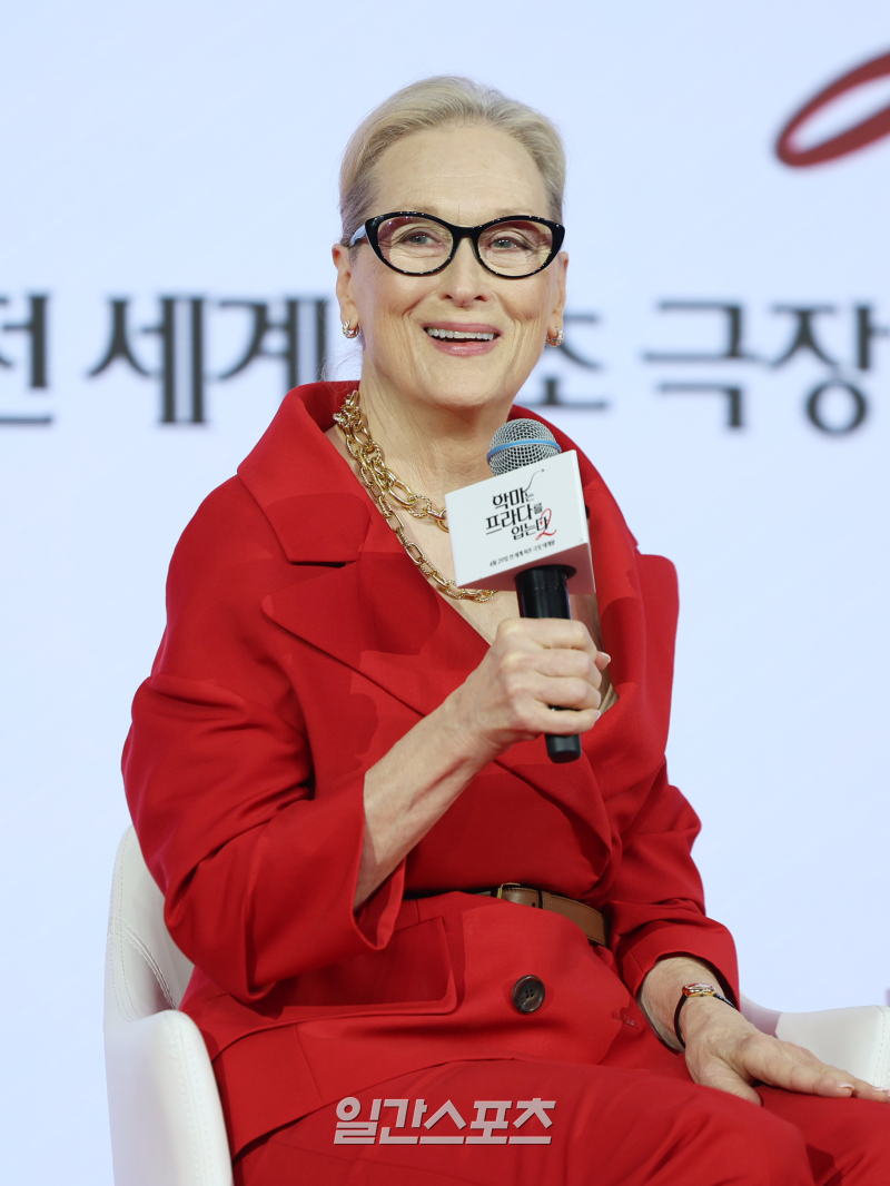 할리우드 배우 메릴 스트립이 8일 오전 서울 종로구 포시즌스 호텔에서 열린 영화 '악마는 프라다를 입는다2' 내한 기자간담회에 참석해 인사말을 하고 있다.