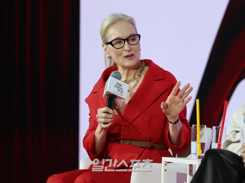 할리우드 배우 메릴 스트립이 8일 오전 서울 종로구 포시즌스 호텔에서 열린 영화 '악마는 프라다를 입는다2' 내한 기자간담회에 참석해 취재진과의 질의응답 시간을 갖고 있다.