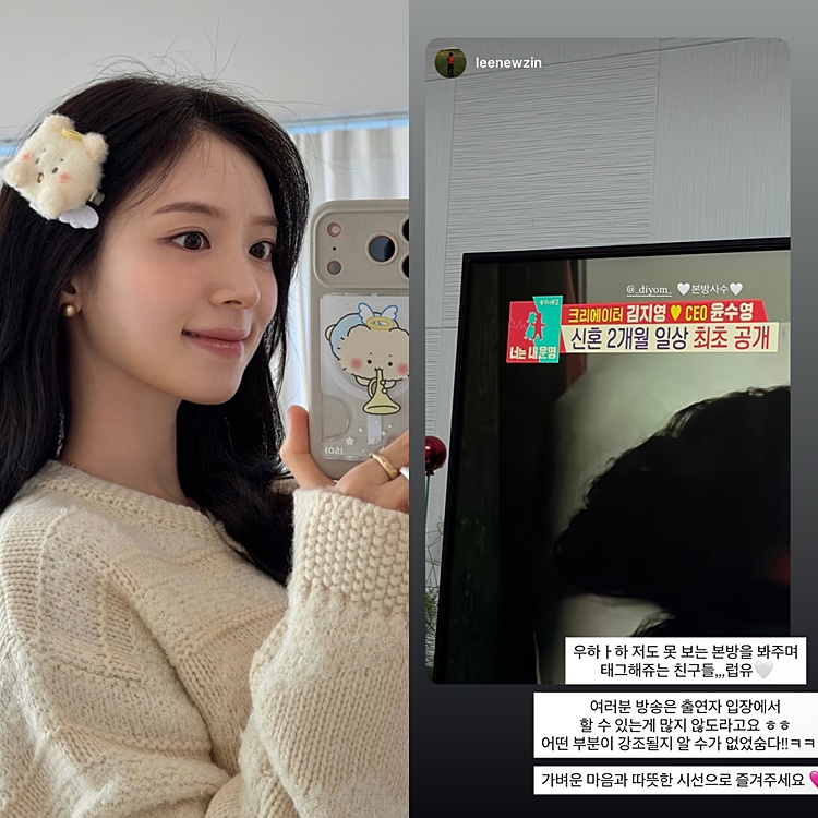 앞서 김지영은 SBS ‘동상이몽2-너는 내 운명’(이하 ‘동상이몽2’)에 남편 윤수영과 함께 출연해 신혼 일상을 공개했다. 방송에서 두 사람은 아침마다 함께 샤워하는 등 다정한 모습으로 화제를 모았다.