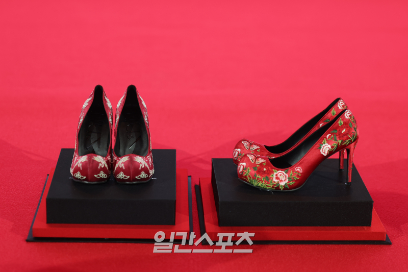 할리우드 배우 메릴 스트립, 앤 해서웨이가 선물로 전달받은 꽃신이 8일 오전 서울 종로구 포시즌스 호텔에서 열린 영화 '악마는 프라다를 입는다2' 내한 기자간담회 무대에 전시돼 있다. 서병수 기자 qudtn@edaily.co.kr /2026.04.08/