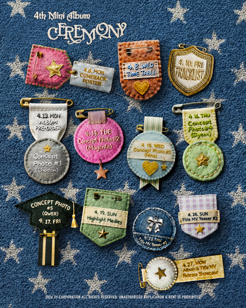 공개된 타임테이블 이미지는 각양각색의 패치 위로 앨범 콘셉트에 대한 힌트를 담은 티징 일정이 적혀있어 눈길을 끈다. QWER은 졸업장을 본뜬 컴백 포스터, 학사모 모양의 패치로 장식된 타임테이블을 차례로 선보이며 '세레머니'로 펼쳐낼 이야기에 대한 궁금증을 높였다.