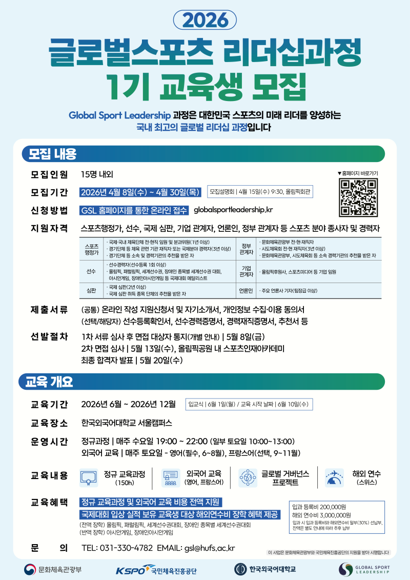 서울올림픽기념국민체육진흥공단(체육공단)과 문화체육관광부가 대한민국 스포츠의 국제적 영향력을 높이고 글로벌 스포츠 무대를 이끌어갈 고위급 인재 양성을 위한 '2026년 글로벌스포츠 리더십과정'의 제1기 교육생을 모집한다고 9일 밝혔다.