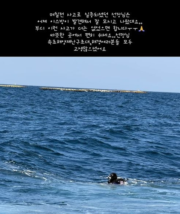 그러면서 “부디 이런 사고가 더는 없었으면 합니다. 따뜻한 곳에서 편히 쉬세요 선장님”이라며 “속초 해양 재난구조대, 해경 여러분들 모두 고생 많으셨어요”라고 고생한 이들에게 마음을 표현하기도 했다.