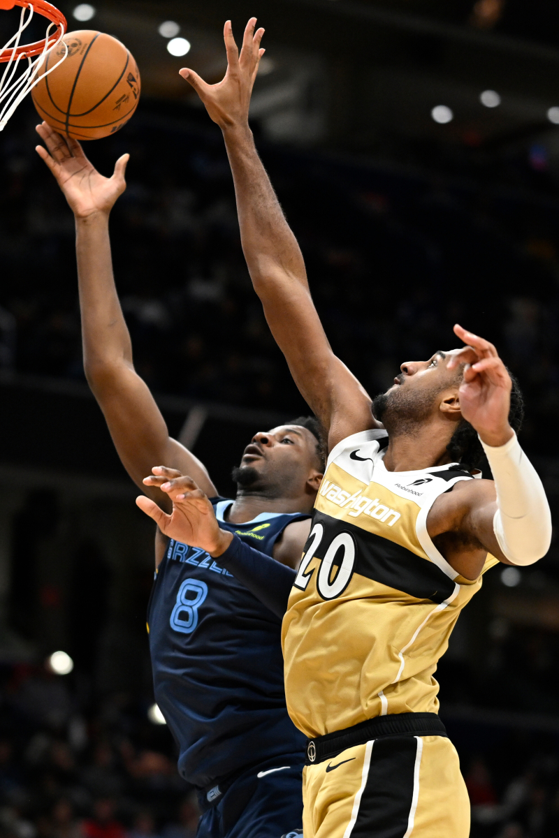 Memphis Grizzlies forward Jaren Jackson Jr. (8) scores a basket against Washington Wizards center Alex Sarr during the second half of an NBA basketball game, Sunday, Dec. 28, 2025, in Washington. (AP Photo/John McDonnell)/2025-12-29 11:24:03/ <저작권자 ⓒ 1980~2025 ㈜연합뉴스. 무단 전재 재배포 금지, AI 학습 및 활용 금지>