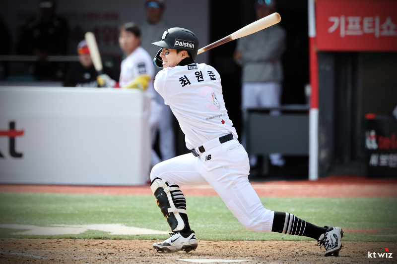 12일 두산전 결승타를 날린 최원준. KT 제공 KT는 12일 수원KT위즈파크에서 열린 두산과의 홈 경기에서 6-1로 승리, 전날 승리(6-4)를 더해 위닝 시리즈(2승 1패)를 달성했다. 시즌 9승 4패를 기록한 KT는 LG 트윈스와 공동 선두를 지켰다.