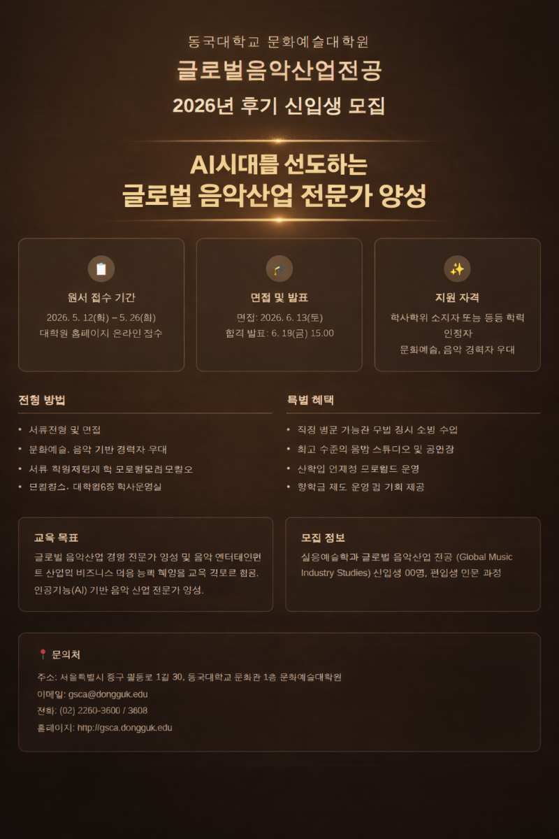 13일 동국대학교 문화예술대학원 실용예술학과에 따르면, 2026학년도 후기 ‘글로벌 음악산업 전공(GMI)’ 석사과정 신입생을 오는 5월 12일부터 26일까지 모집한다.