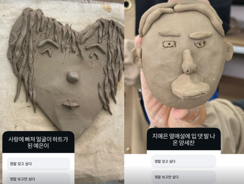 특히 지예은이 만든 작품에는 ‘사랑에 빠져 얼굴이 하트가 된 예은이’라고 적었으며, 지예은과 ‘방송 썸’ 러브라인으로 엮어온 양세찬의 작품에는 ‘지예은 열애설에 입 댓 발 나온 양세찬’이란 문구를 달아 웃음을 안겼다.