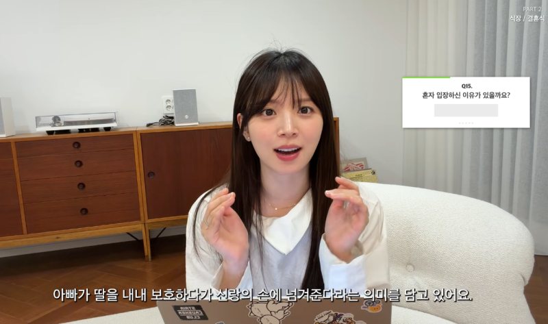 그러면서 “원래 딸과 아빠가 같이 가는 게 아빠가 딸을 내내 보호하다가 신랑의 손에 넘겨준다는 의미를 담고 있다더라”며 “그런데 전 성인이 된 후에도 어쨌든 부모님께 따로 지원 받지 않았고 되게 독립적으로 살기 위해 노력했다”고 밝혔다.