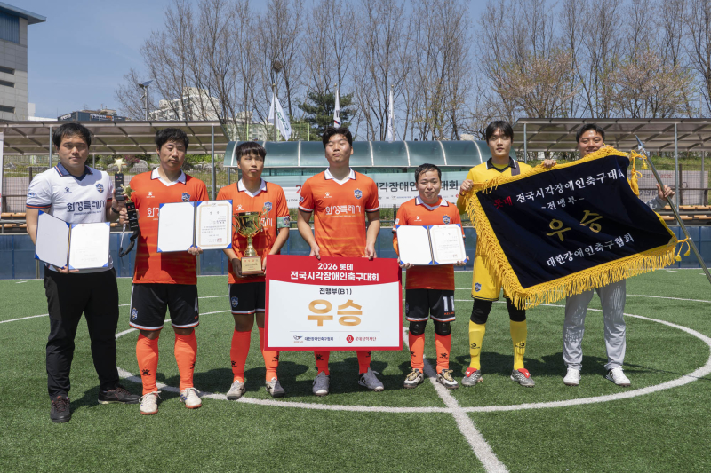 화성시각축구단은 지난 11~12일 서울 송파구 송파시각장애인축구장에서 열린 ‘2026년 롯데 전국시각장애인축구대회’에서 전맹부 우승 트로피를 들어올렸다. 이로써 화성시각축구단은 창단 이래 이 대회에서 3년 연속 우승 대기록으로 ‘맹호’다운 실력을 뽐냈다.
