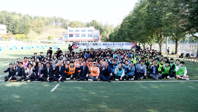 포항 스틸러스는 지난 10일 포항제철중학교에서 “포항 스틸러스-경상북도교육청이 함께하는 체육 교사 축구 지도법 직무연수를 진행했다”고 13일 밝혔다. 이날 행사에는 포항 스틸러스 U12, U15 지도자들과 선수 6명(조상혁, 이수아, 이헌재, 김범준, 윤대근, 조영준)이 일일 선생님으로 함께했다.