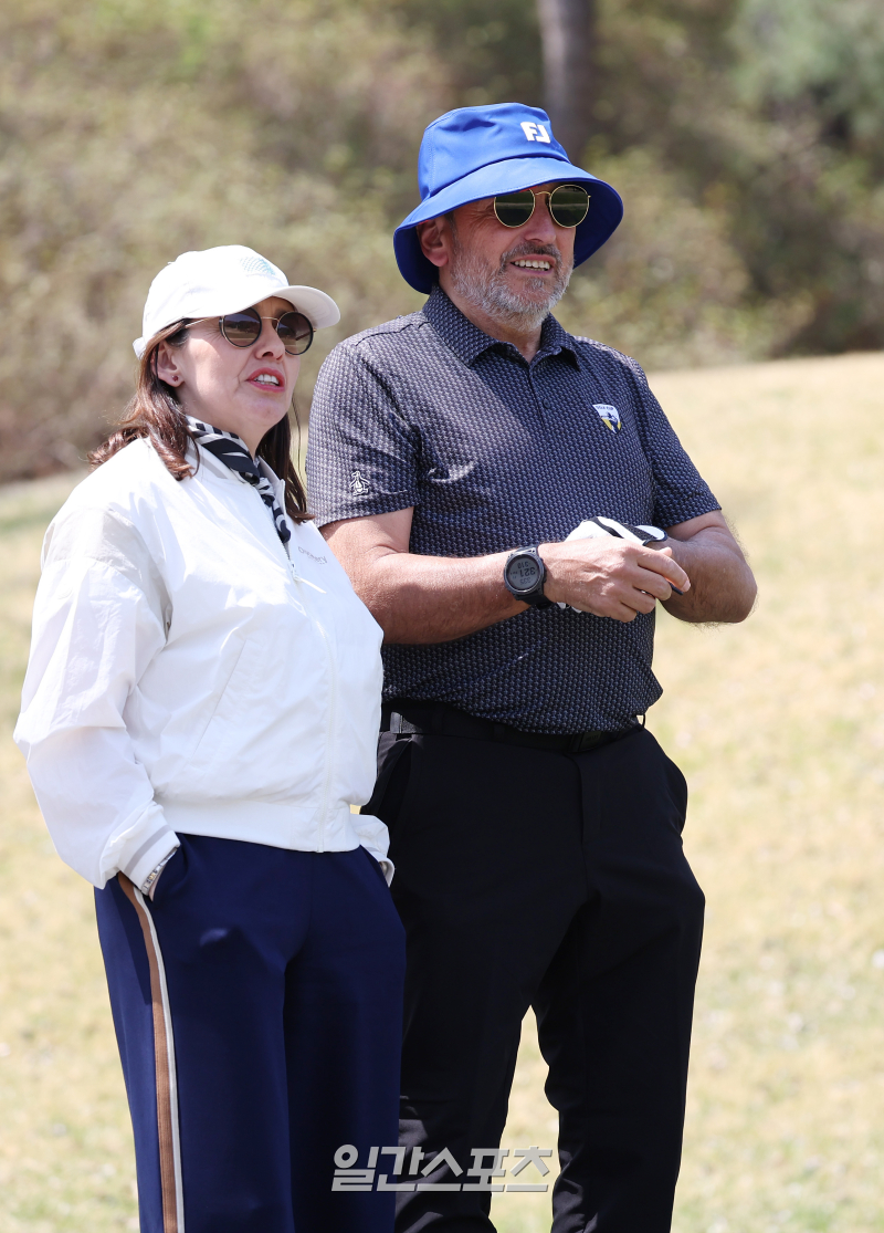 루이 퀸타 청주FC 감독이 13일 경기도 용인 코리아CC에서 열린 '2026 축구인 골프대회'에 참가해 여자친구와 함께 동료들의 플레이를 지켜보고 있다.