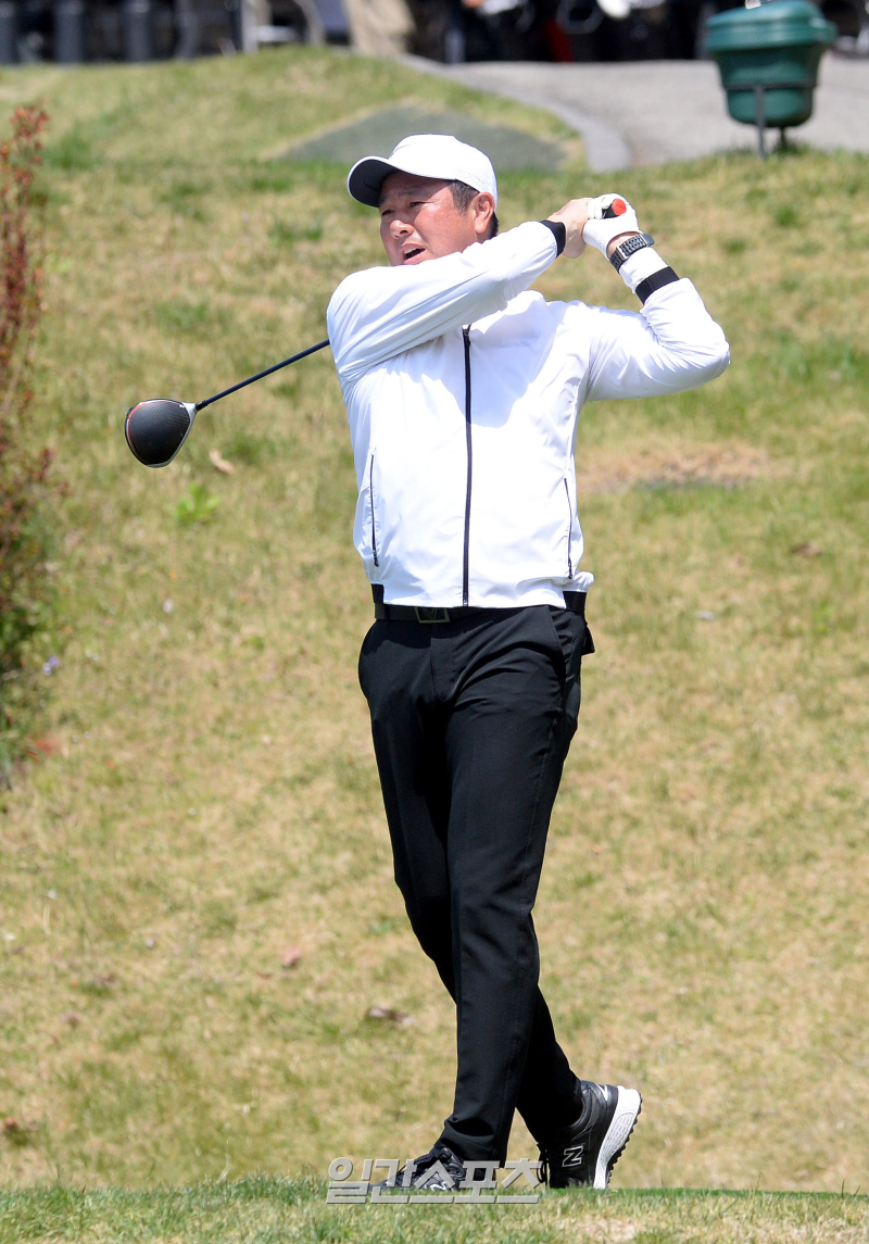 김도균 서울이랜드FC 감독이 13일 경기도 용인 코리아CC에서 열린 '2026 축구인 골프대회'에서 티샷을 날리고 있다.