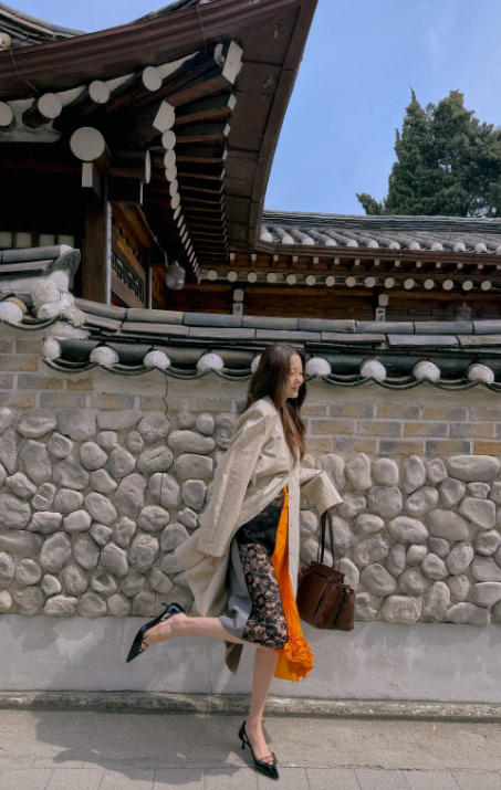 사진 속 고현정은 베이지색 트렌치 코트와 검은 레이스와 오렌지빛 포인트를 준 원피스를 매치한 봄 착장을 입고 한옥 앞에서 포즈를 취하고 있다.