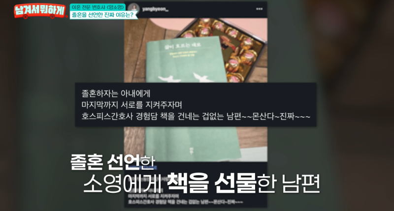 자녀들도 전부 서울대학교 출신으로 현재 자신의 길을 찾아가고 있는 중이다. 양소영은 “아이들이 떠나고 나니까 (결혼 전으로)다시 돌아가고 싶더라. 남편이 싫고 좋고를 떠나서 내 인생을 다시 한번 조금 찾아보고 싶다는 생각이 들었다”고 털어놨다. 사진=tvN 스토리 다만 남편의 회유로 졸혼 선언은 번복했다고 했다. 양소영은 “남편이 호스피스 간호사가 쓴 책을 선물해줬다”며 “책에 밑줄이 다 쳐져있더라. 보면서 배우자란 무엇인지, 내가 마지막을 누구랑 마무리하고 싶은지를 생각한 뒤 무효화를 슬쩍 했다”고 밝혔다.