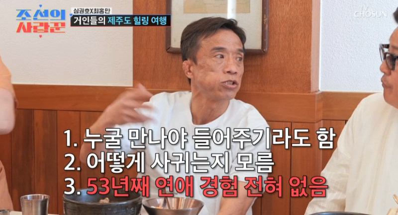 이에 심권호는 “그러고 싶겠냐”고 억울해했다. 최홍만은 “여자와 가까워지고 싶다면 그 사람의 이야기를 많이 듣고 호응을 해줘야 한다”고 조언했다. 사진=TV조선 그러나 심권호는 “그러고 싶어도 누굴 만난 적도 없고, 어떻게 사귀는지 이해가 안 된다. 연애를 해본 적이 없으니까”라고 당당히 말했다.