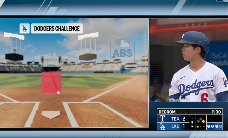사연은 이렇다. 김혜성은 9번 타자·2루수로 선발 출전한 텍사스 선발 투수 제이콤 디그롬과의 첫 타석 승부 볼카운트 2볼-2스트라이크에서 몸쪽(좌타자 기준) 슬라이더를 공략하지 못해 루킹 삼진을 당했다. 심판의 공 판정이 나온 뒤 그는 왼손으로 헬멧을 치며 ABS 신청 제스처를 취했다. 판독 결과 디그롬의 공이 스트라이크존 하단에 살짝 걸쳤다.