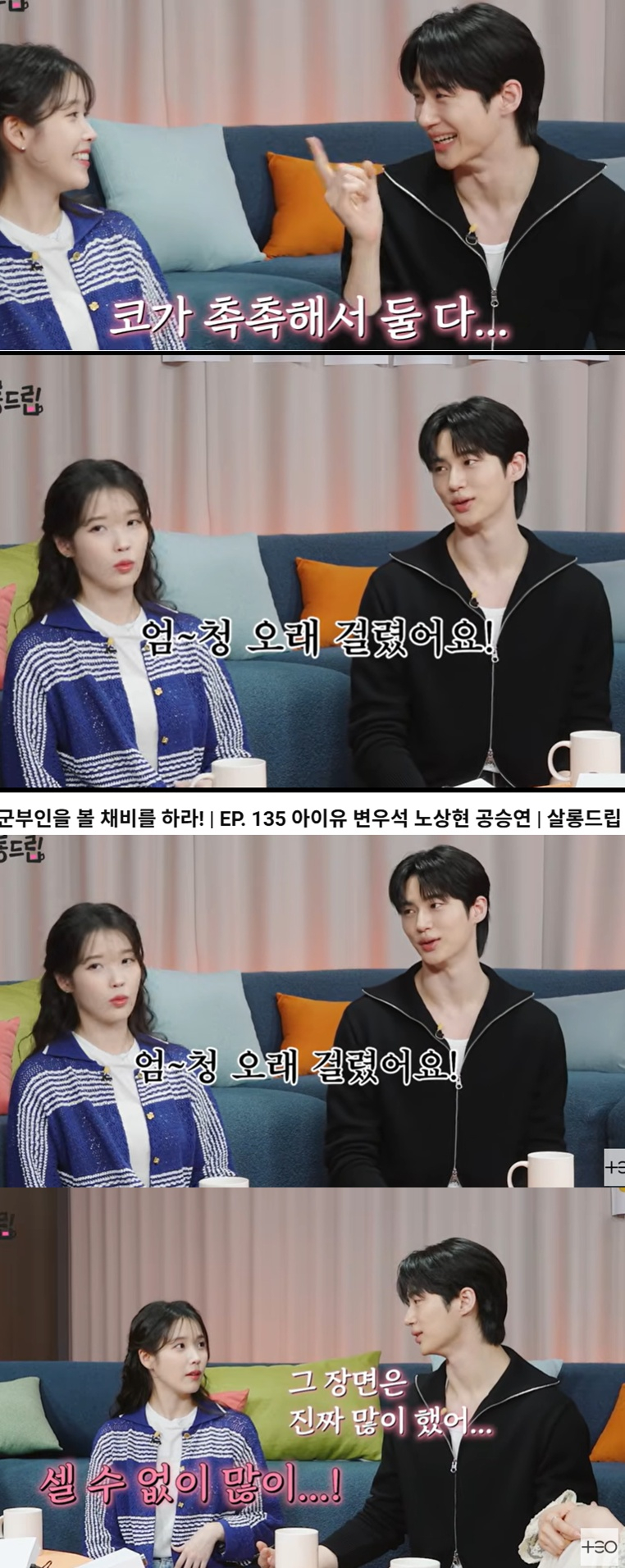 변우석 역시 촬영의 디테일을 덧붙였다. 그는 “뽀뽀신이다 보니 얼굴이 가까워질 수밖에 없는데, 서로 코가 닿는 순간 촉촉함이 느껴졌다”고 밝혀 웃음을 자아냈다. 이에 아이유도 “코에 땀이 나다 보니 볼에 자국이 남아서 계속 수정해야 했다”고 설명했다.