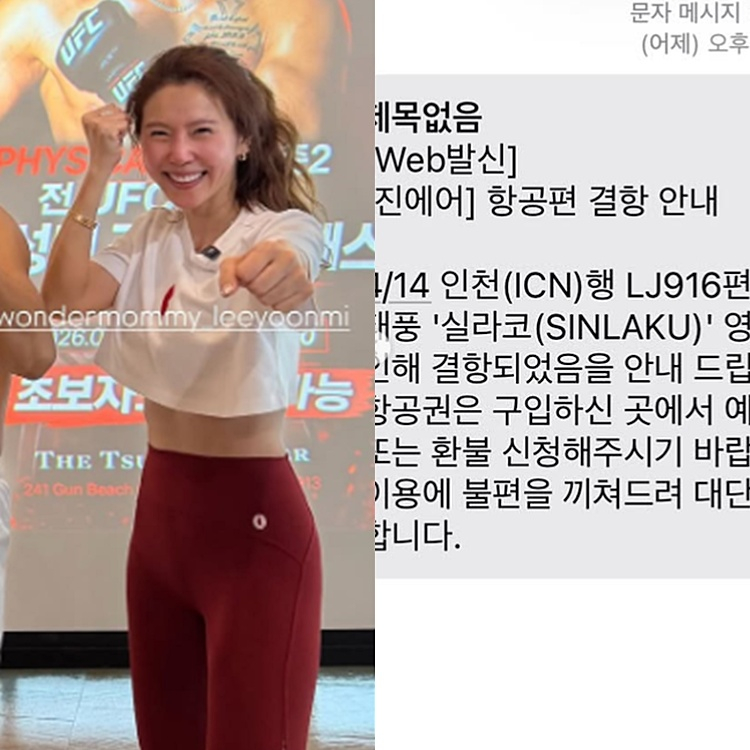 이윤미는 최근 자신의 SNS를 통해 태풍 실라코의 영향으로 항공편이 잇따라 취소되면서 귀국 일정에 차질이 생겼다고 밝혔다. 당초 귀국 예정이었으나 비행편이 결항되며 현지에 머물게 된 상황이다.